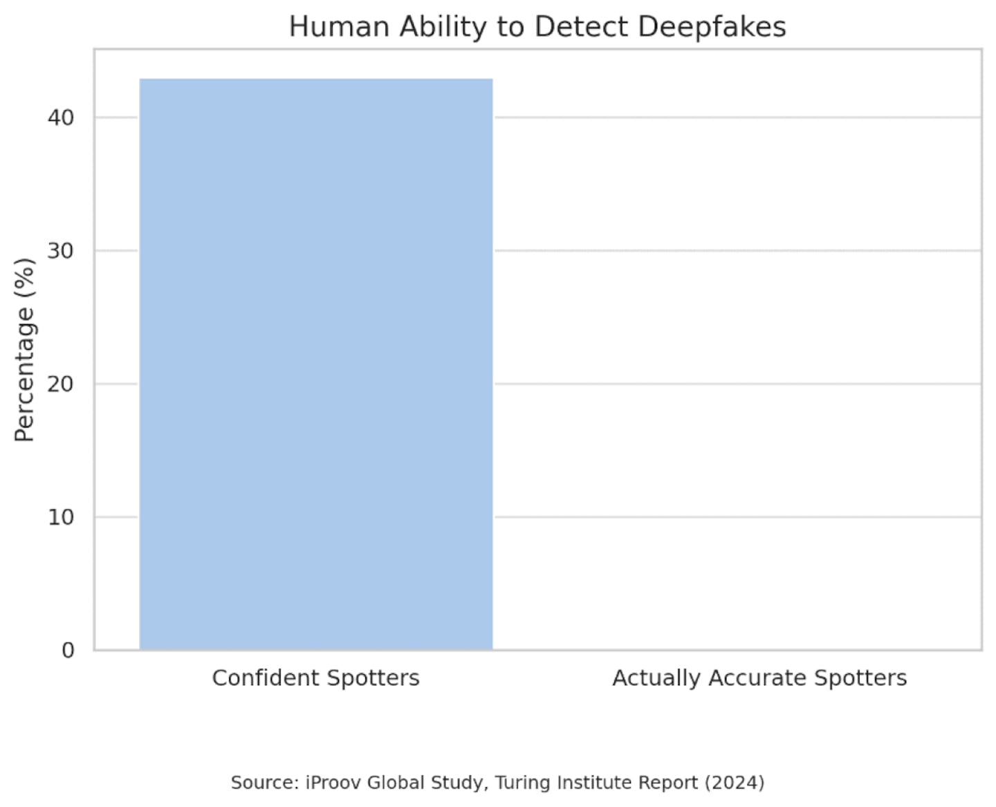 A 2024 study from iProov revealed a significant gap between confidence and accuracy in detecting deepfakes. While 60% of respondents claimed they were confident in their ability to identify deepfakes, the reality was starkly different.