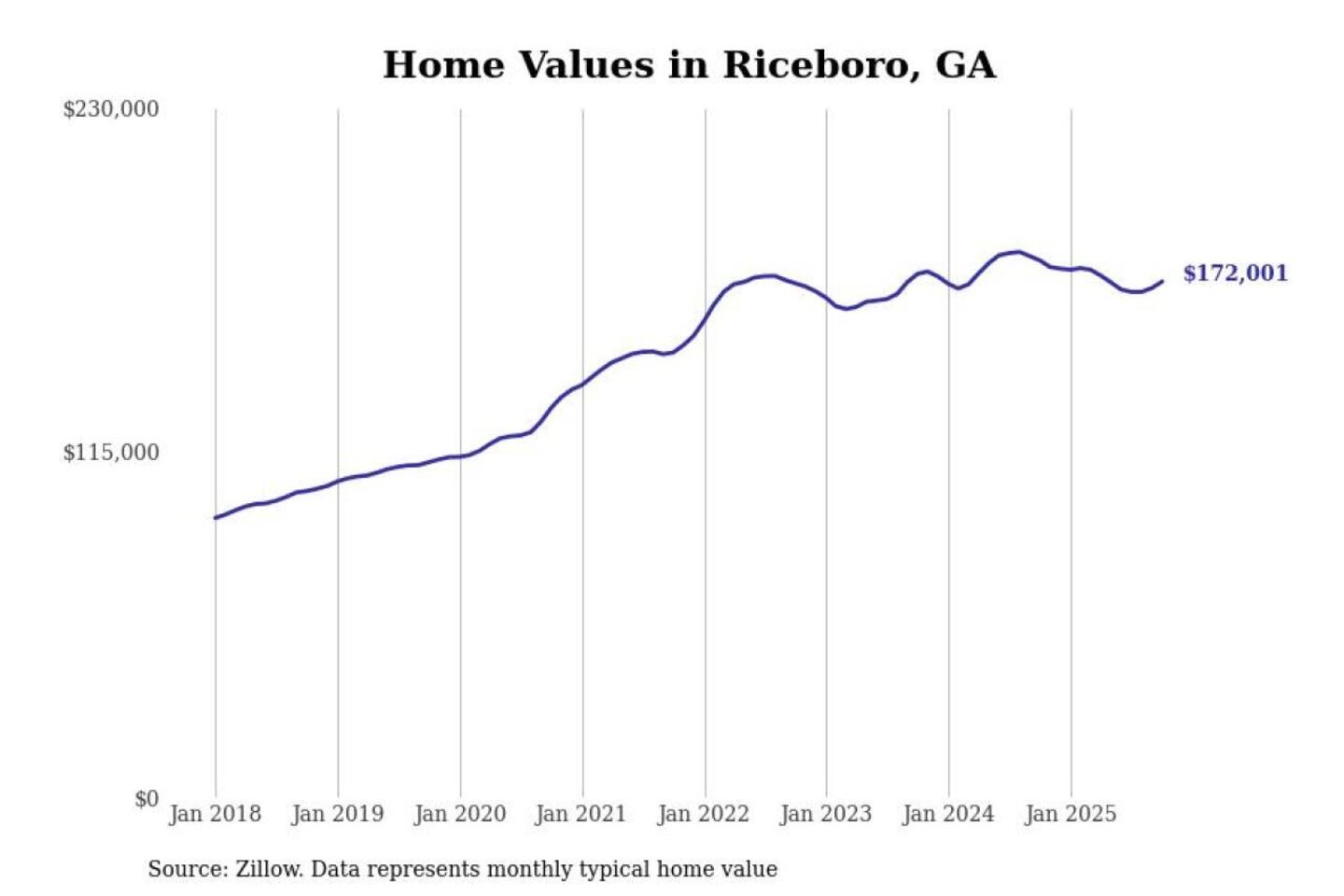 Stacker compiled a list of cities with the most expensive homes in the Hinesville, GA metro area using data from Zillow. Charts show the monthly typical home value since January 2018.