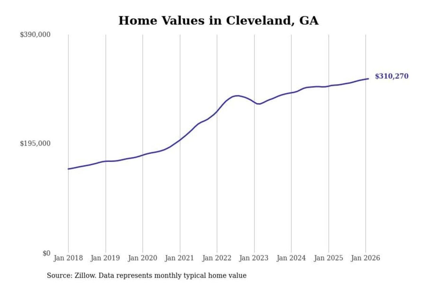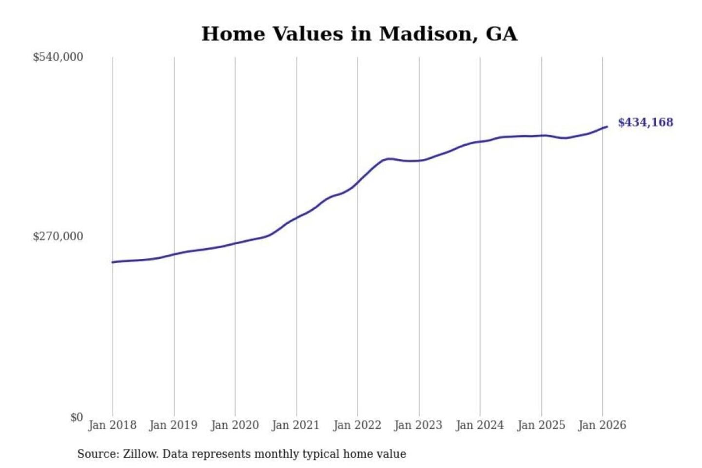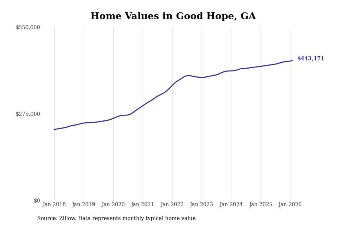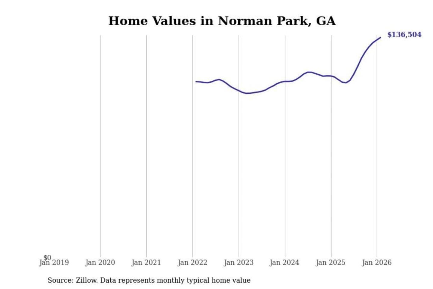 Stacker compiled a list of cities with the fastest-growing home prices in Georgia using data from Zillow. Cities are ranked by the dollar change in the Zillow Home Values Index for all homes from the 12 months ending February 2026. The charts in this story were created automatically using Matplotlib. Data was available for 50 cities and towns in Georgia.