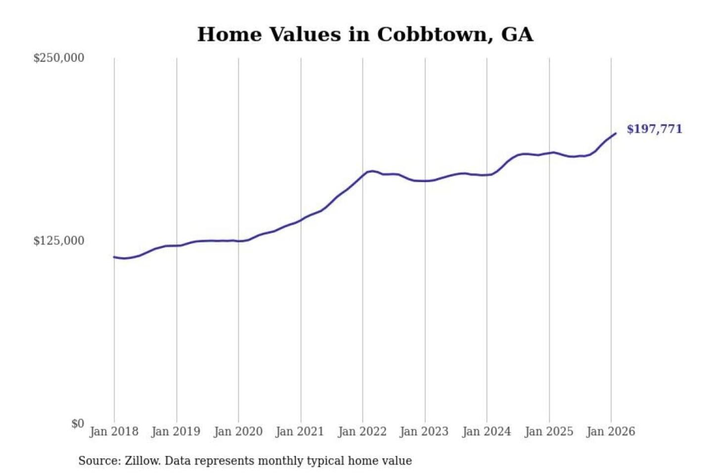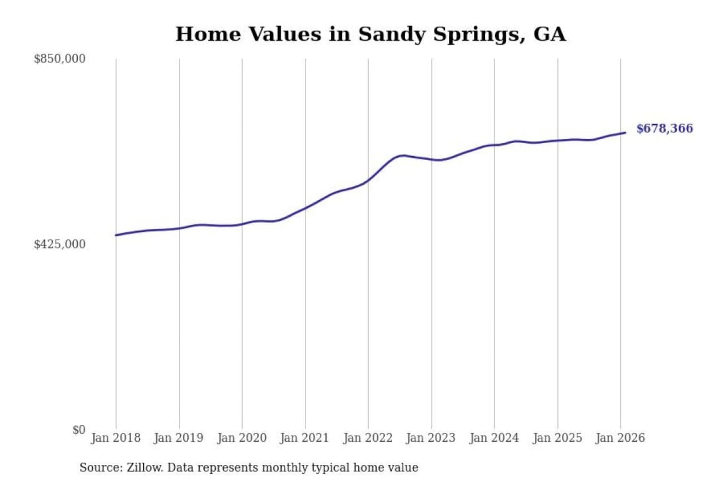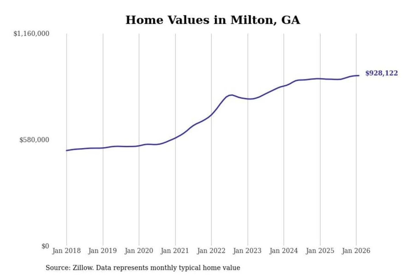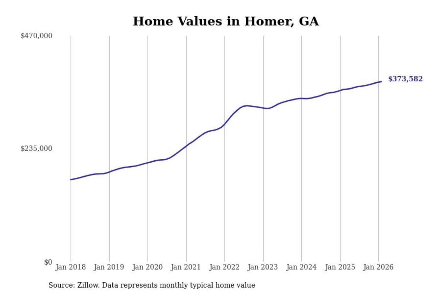 Stacker compiled a list of cities with the fastest-growing home prices in Georgia using data from Zillow. Cities are ranked by the dollar change in the Zillow Home Values Index for all homes from the 12 months ending February 2026. The charts in this story were created automatically using Matplotlib. Data was available for 50 cities and towns in Georgia.