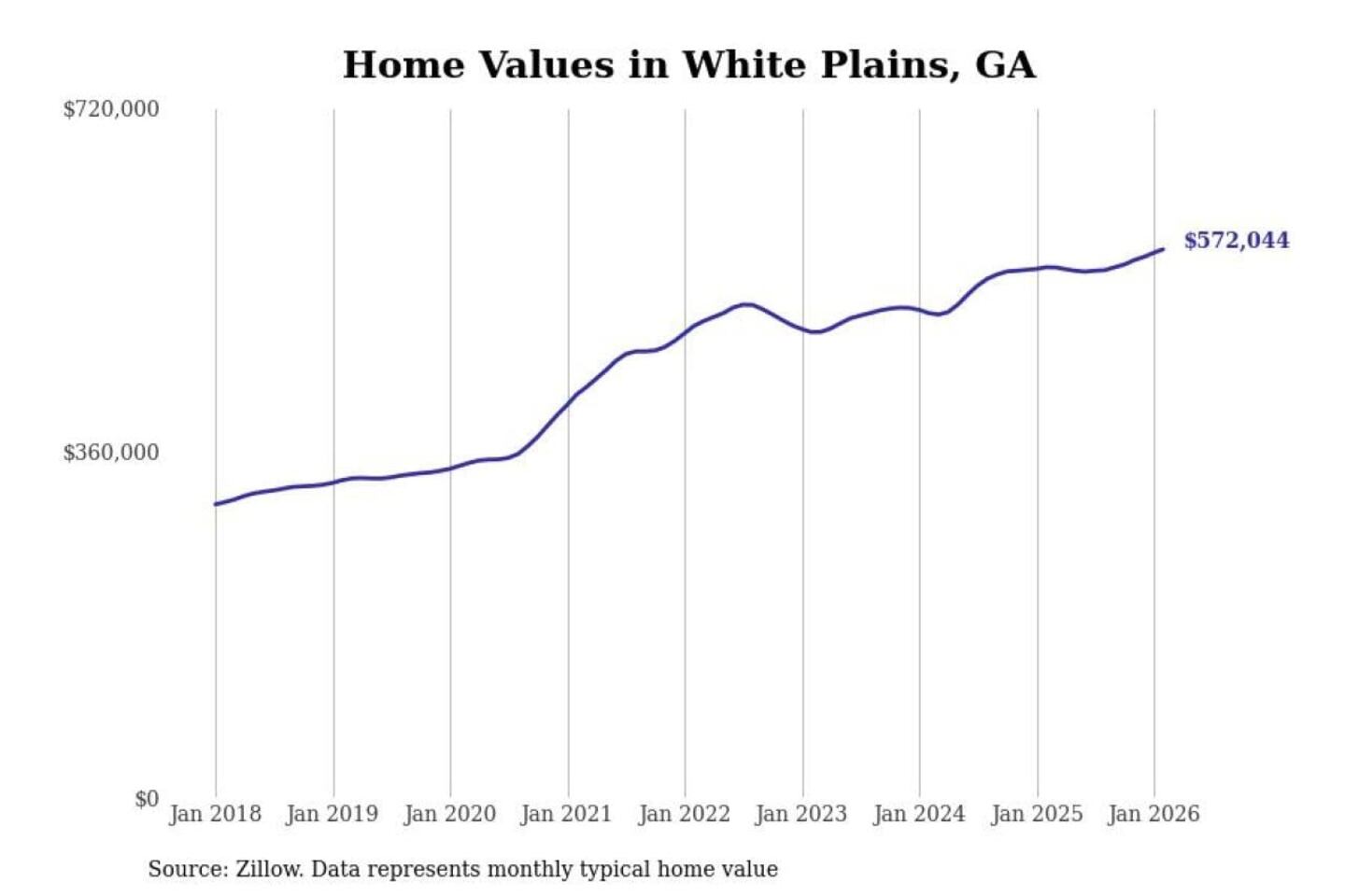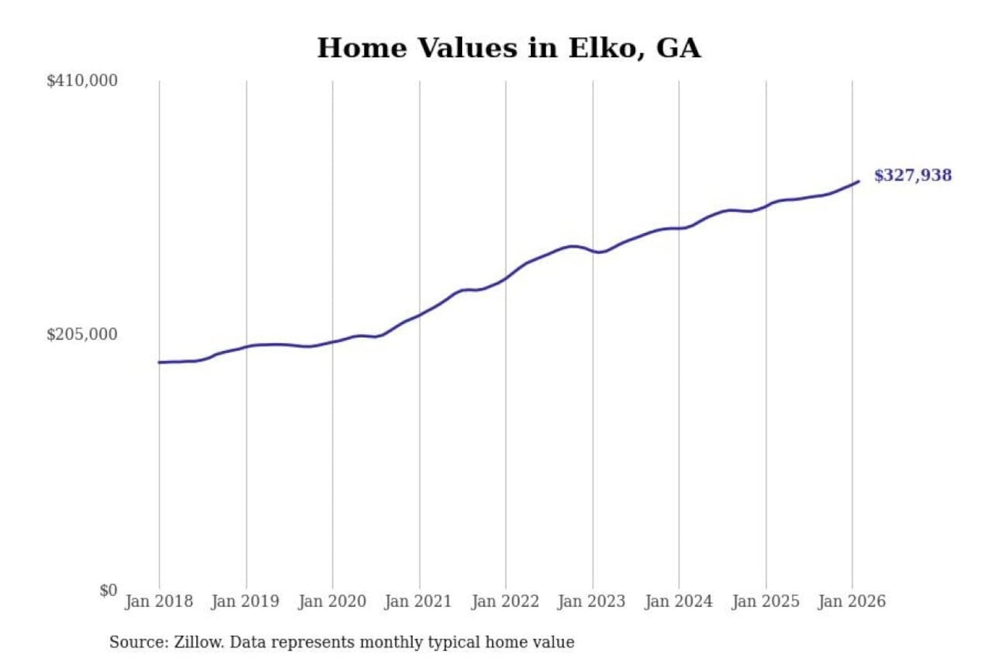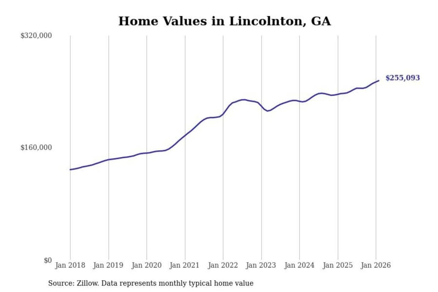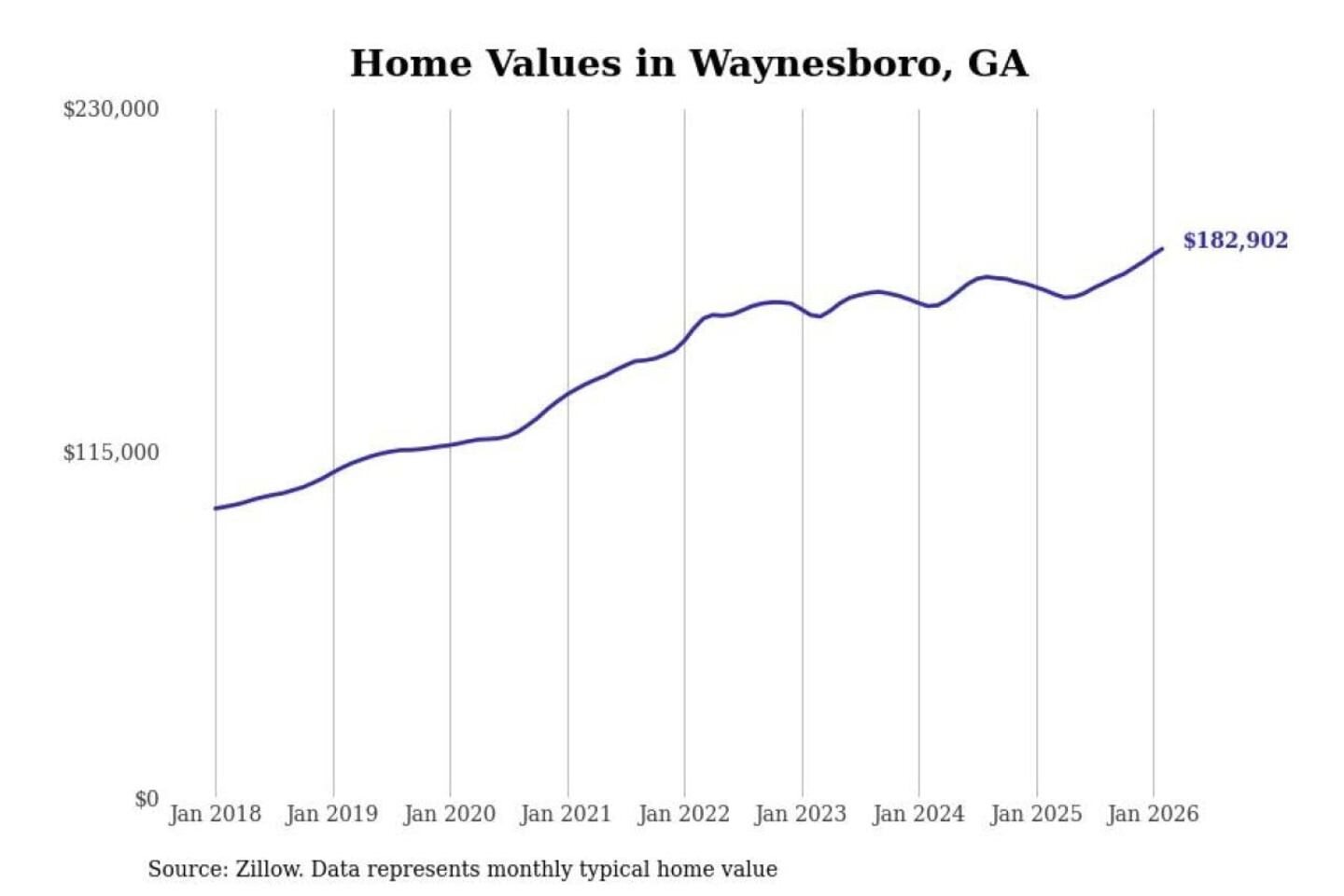 Stacker compiled a list of cities with the fastest-growing home prices in Georgia using data from Zillow. Cities are ranked by the dollar change in the Zillow Home Values Index for all homes from the 12 months ending February 2026. The charts in this story were created automatically using Matplotlib. Data was available for 50 cities and towns in Georgia.