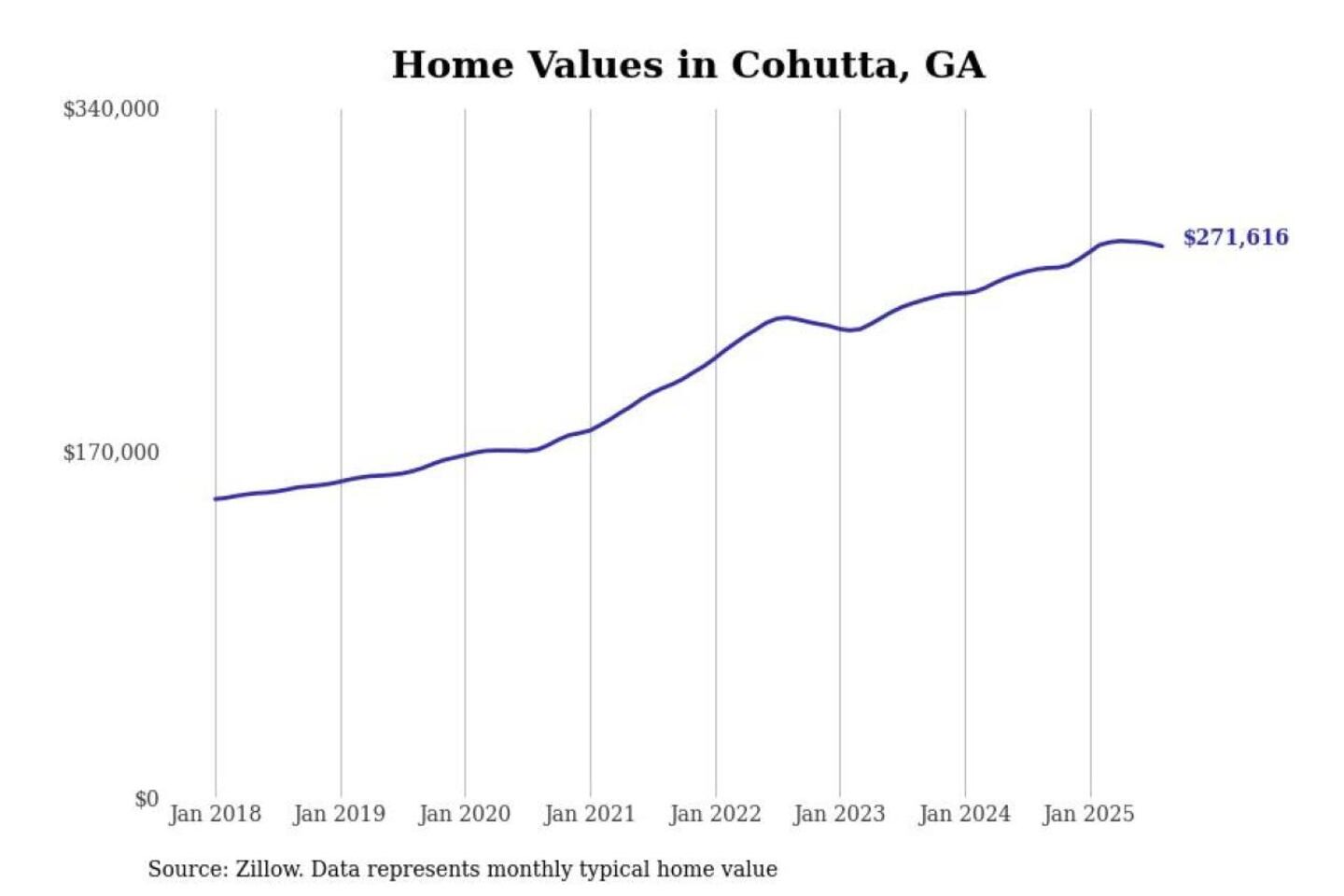 Stacker compiled a list of cities with the most expensive homes in the Dalton metro area using data from Zillow. Charts show the monthly typical home value since January 2018. All 8 cities and towns with data available were included in the list.