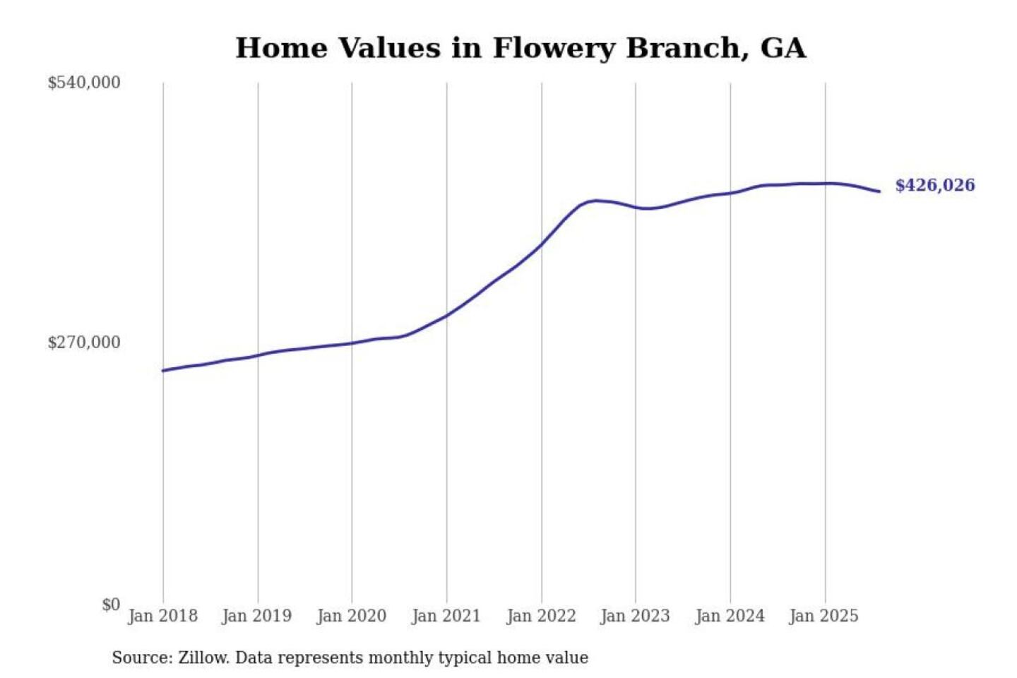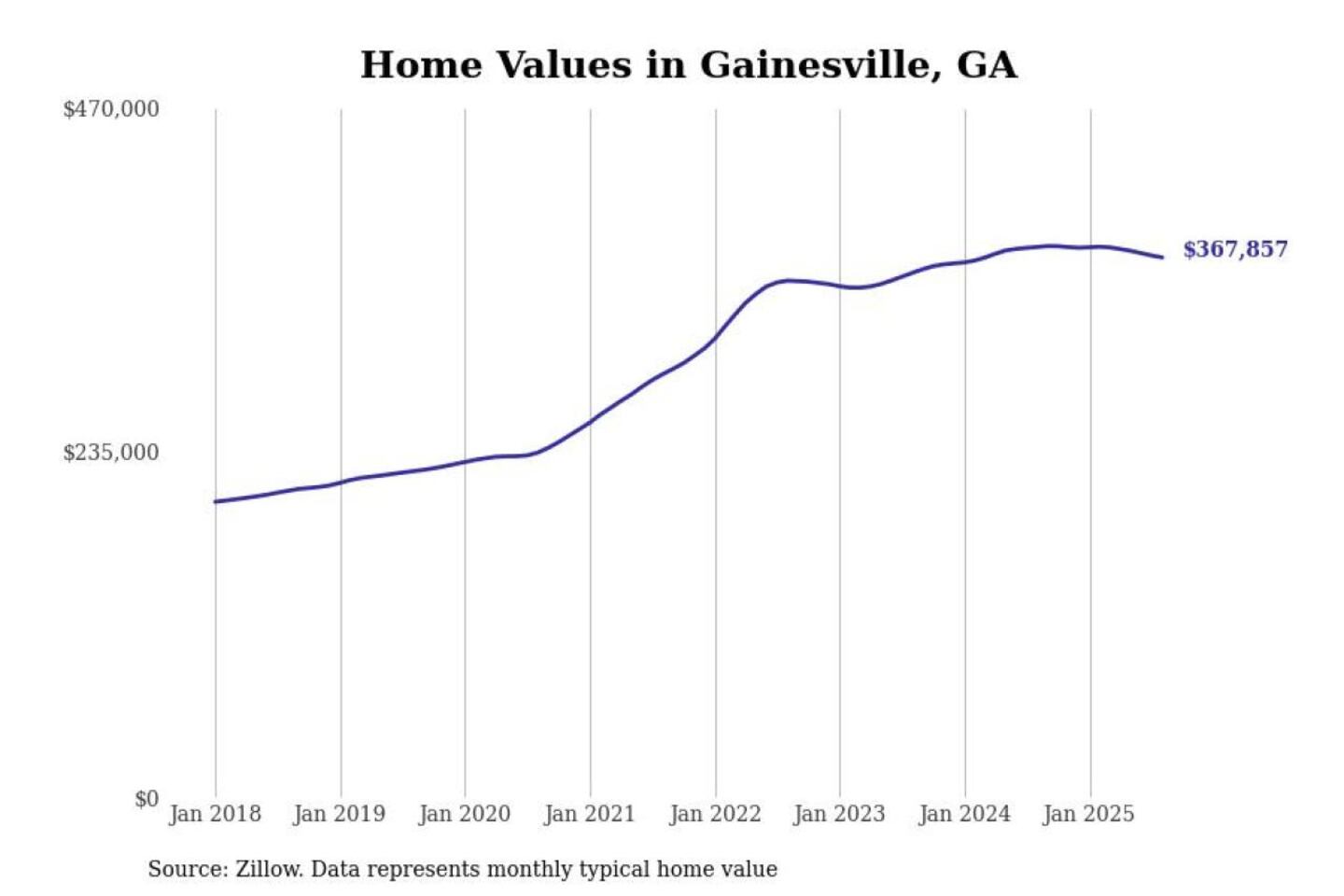 Stacker compiled a list of cities with the most expensive homes in the Gainesville, Georgia metro area using data from Zillow. Charts show the monthly typical home value since January 2018. All 7 cities and towns with data available were included in the list.