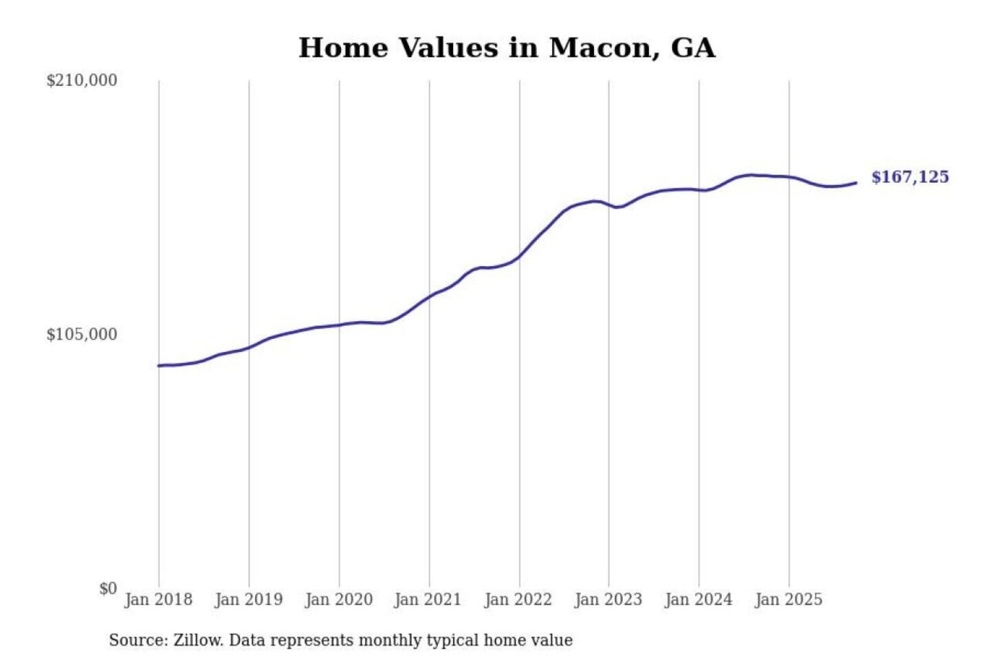 Stacker compiled a list of cities with the most expensive homes in the Macon metro area using data from Zillow. Charts show the monthly typical home value since January 2018. All 14 cities and towns with data available were included in the list.