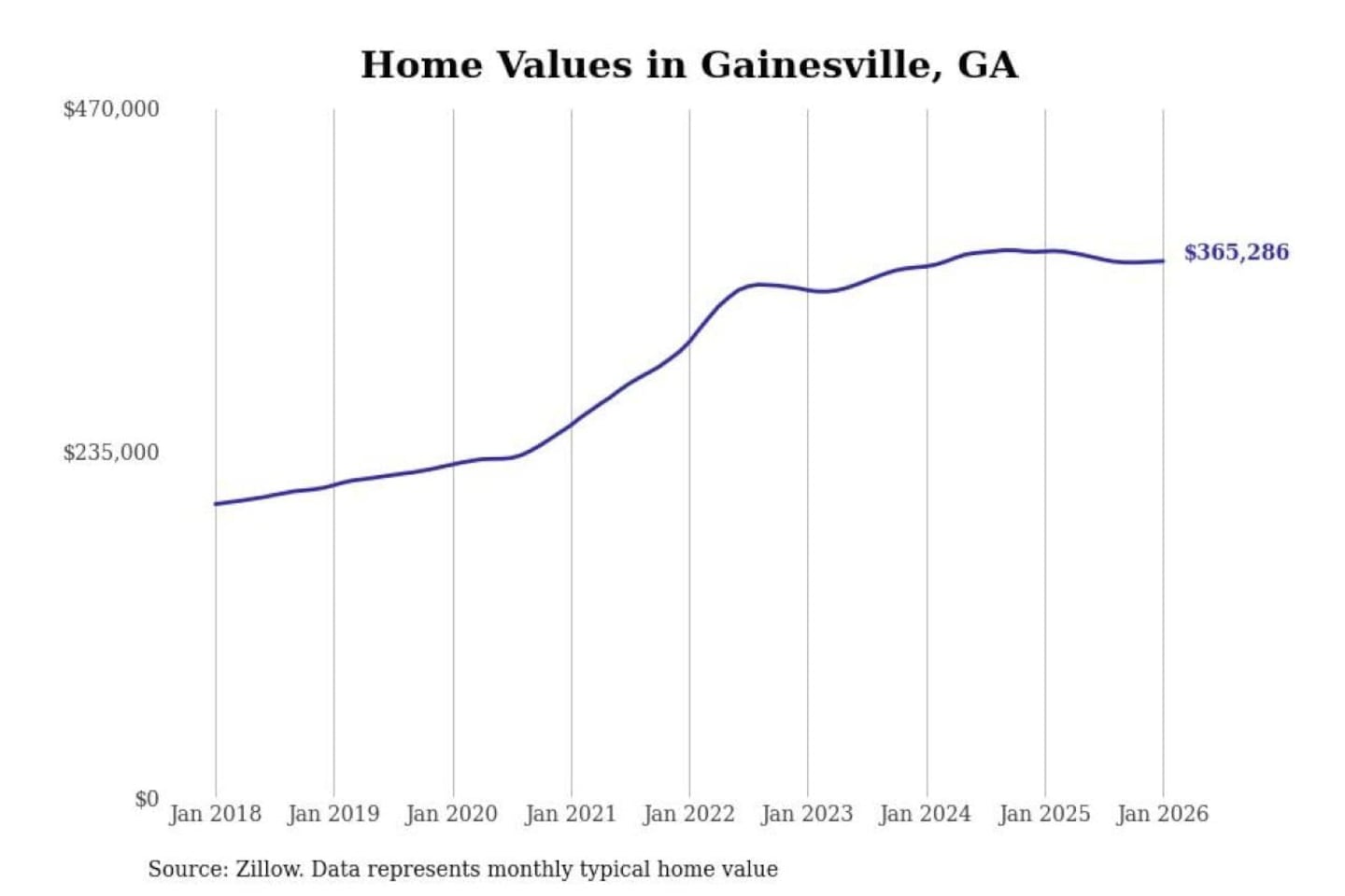 Stacker compiled a list of cities with the most expensive homes in the Gainesville, Georgia metro area using data from Zillow. Charts show the monthly typical home value since January 2018. All 7 cities and towns with data available were included in the list.