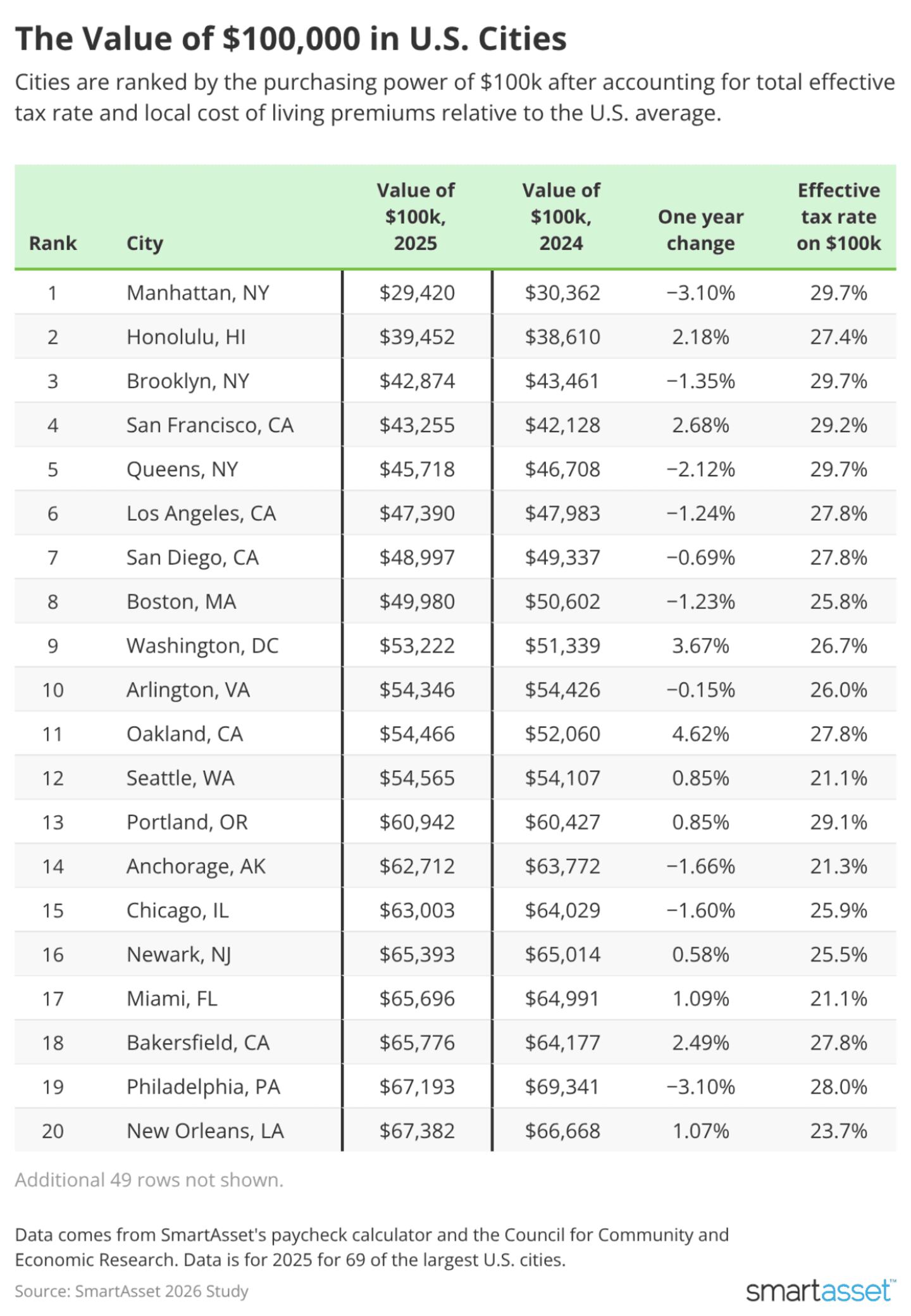 Cities are ranked based on the effective purchasing power of a $100,000 income after accounting for taxes and the local cost of living premium relative to U.S. average.