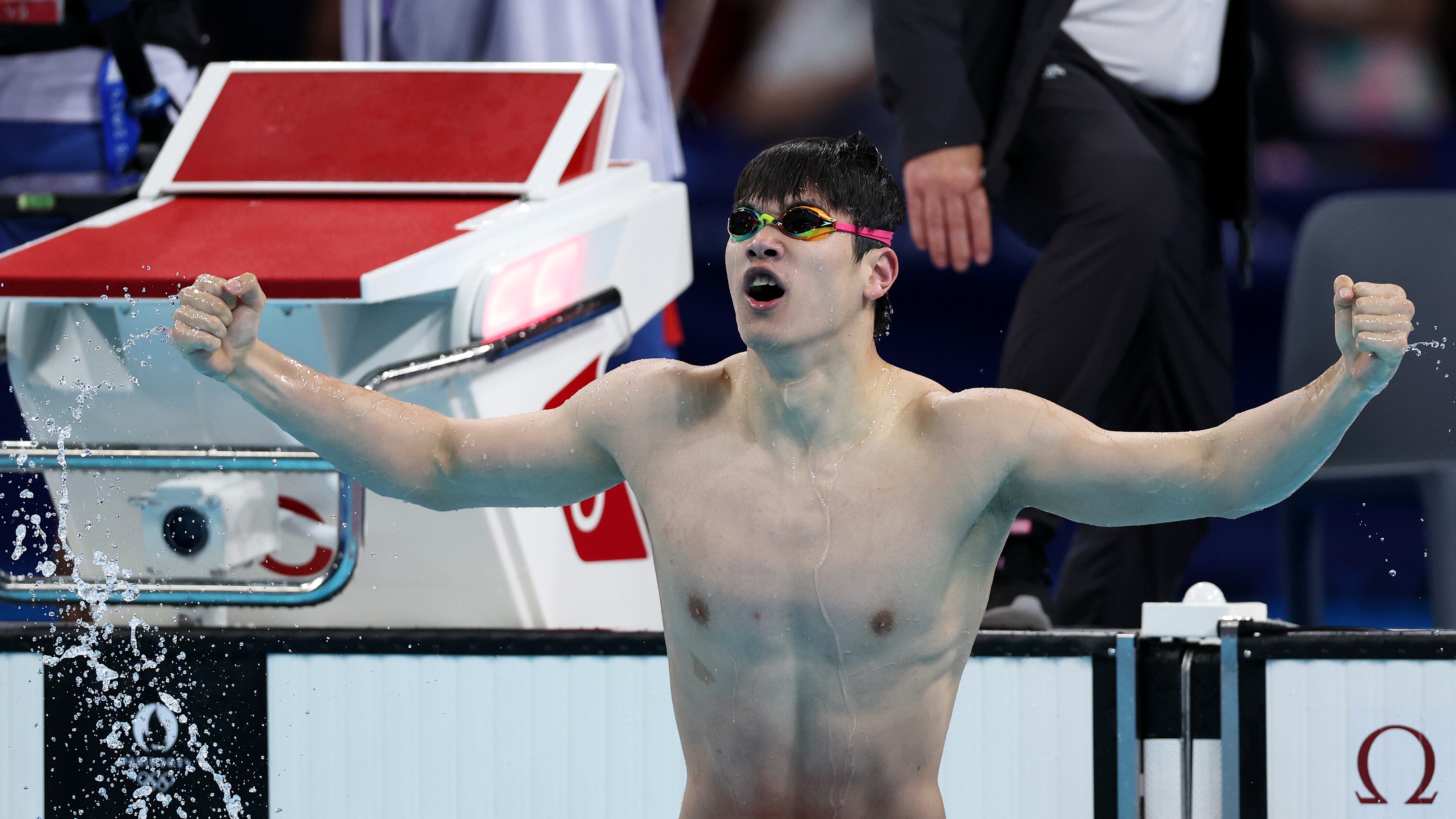 Swimming - Olympic Games Paris 2024: Day 5 NANTERRE, FRANCE - JULY 31: Zhanle Pan of Team People's Republic of China celebrates after winning gold in a world record time in the Men's 100m Freestyle Final on day five of the Olympic Games Paris 2024 at Paris La Defense Arena on July 31, 2024 in Nanterre, France. (Photo by Quinn Rooney/Getty Images) (Quinn Rooney/Getty Images)