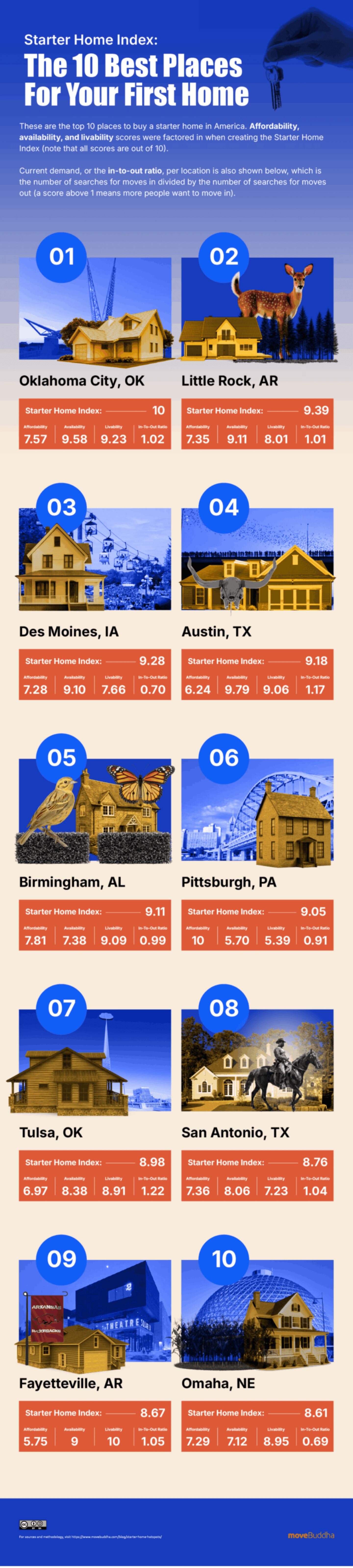 • #1 Oklahoma City is the top city for starter home buyers in the U.S., with high scores across the three core categories: affordability, availability, and livability. #2 Little Rock, #3 Des Moines, #4 Austin, and #5 Birmingham round out the top five.