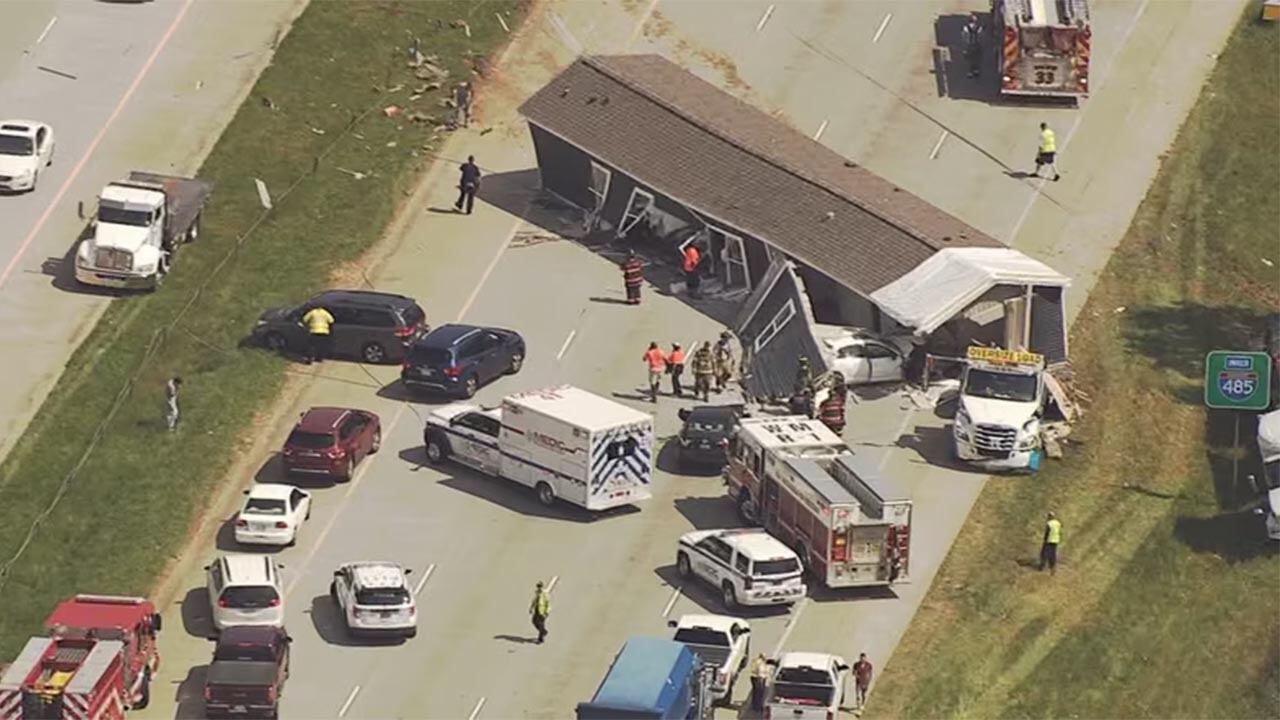 WSOC reported that a mobile home fell onto Interstate 485 in Charlotte on Thursday morning.