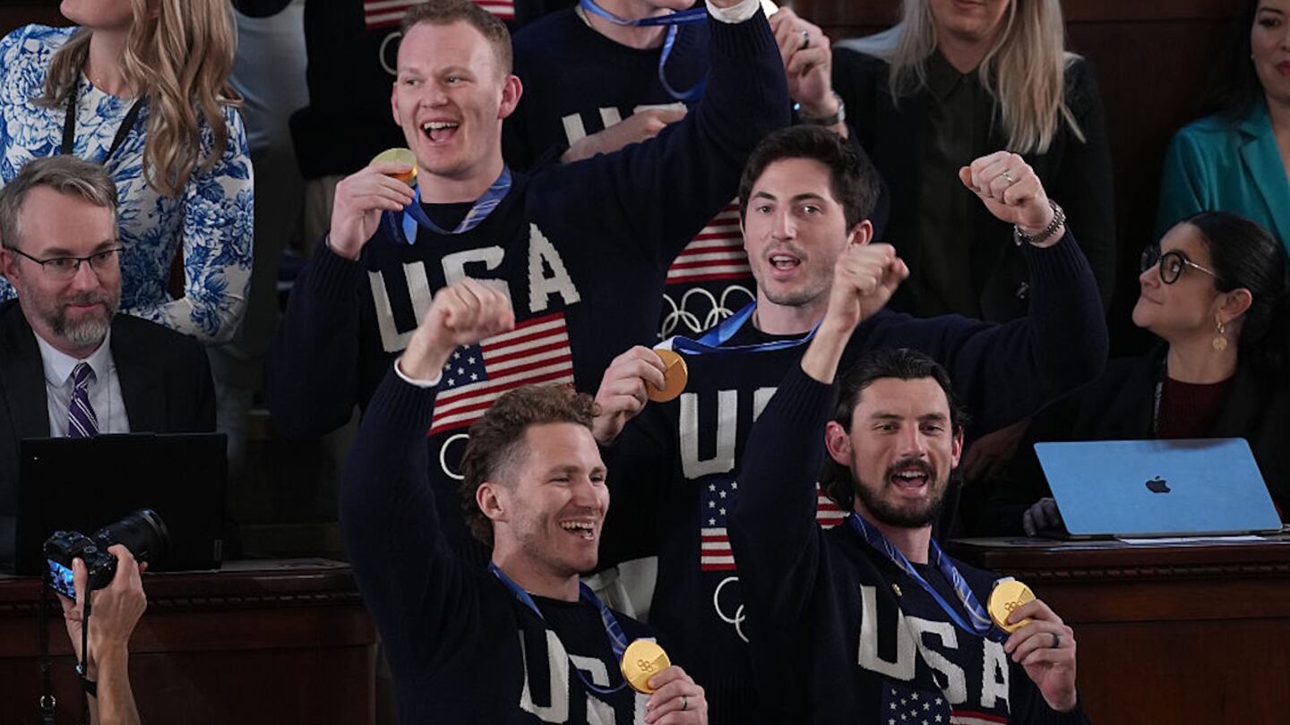 “The men’s gold medal Olympic hockey team, come on in. (Audience chants “USA”). Go ahead. That’s the first time I’ve ever seen them get up. (Laughter) And actually, not all of them did get up. But they beat a fantastic Canadian team in overtime, as everybody saw -- as did the American women who will soon be coming to the White House.